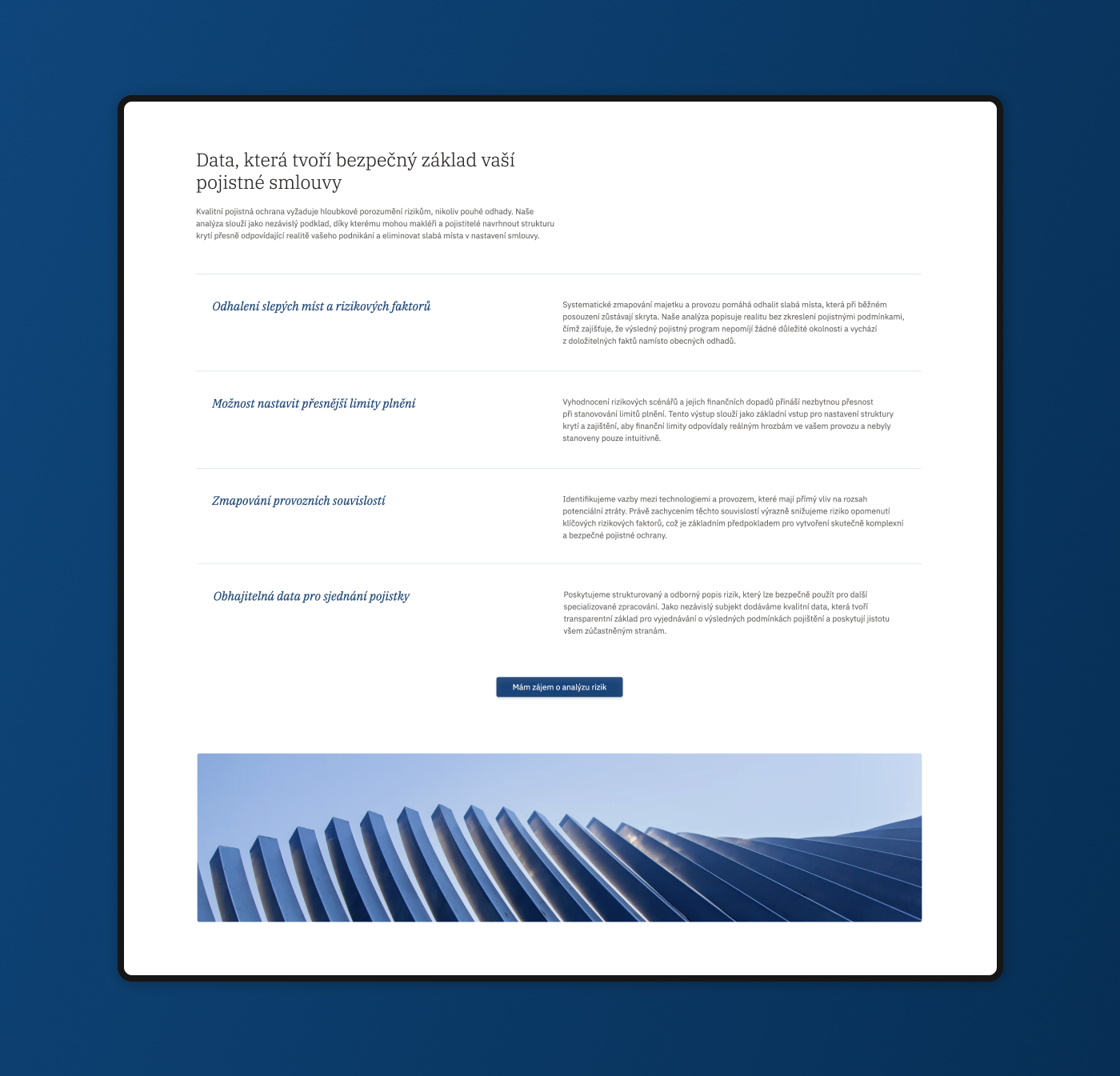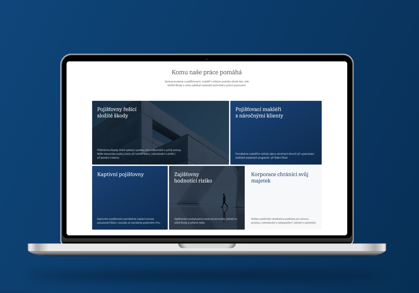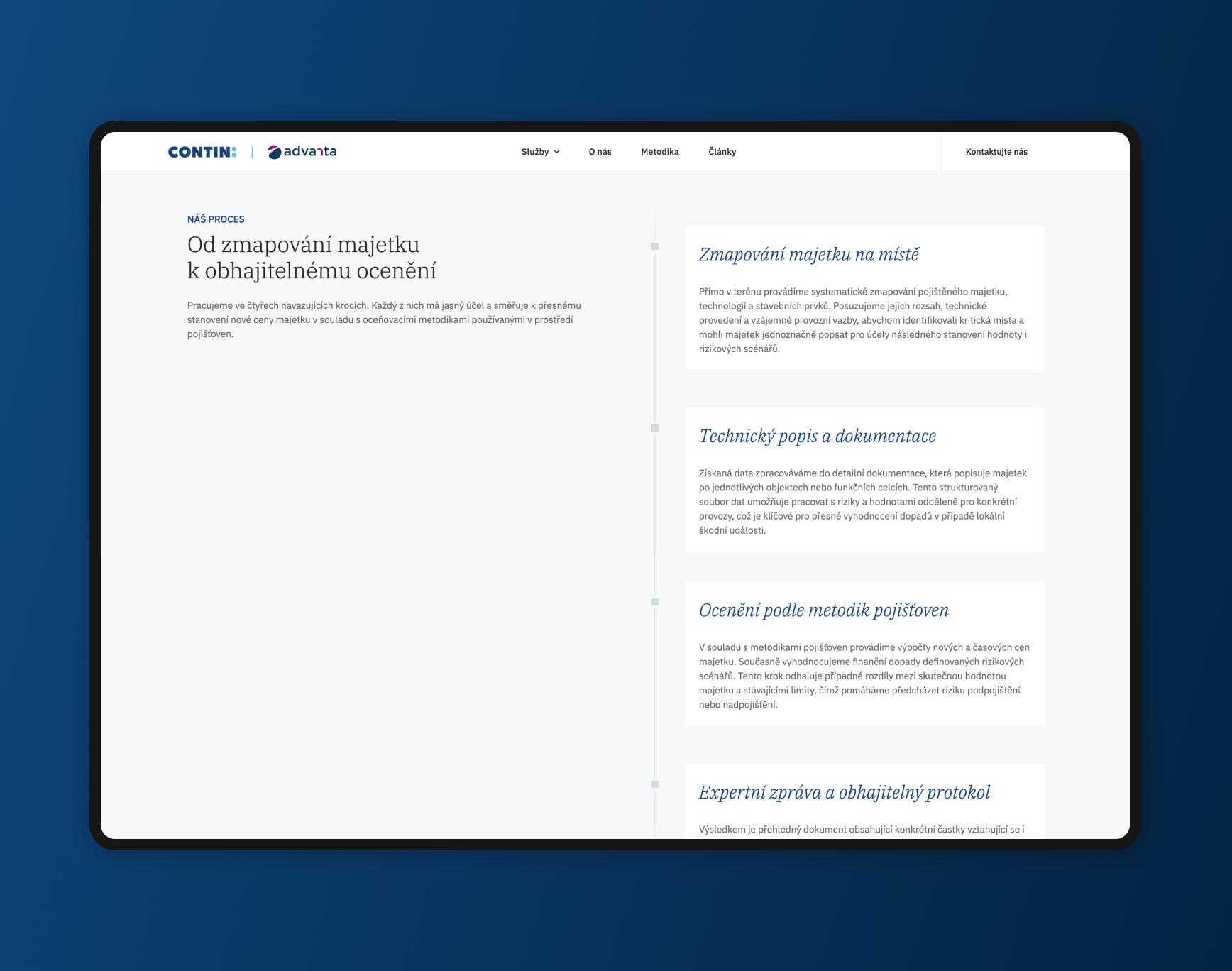 Srdcem celého řešení jsou kromě homepage a sekce „O nás“ především tři stránky služeb: loss adjustment, analýza rizik a forenzní šetření v terénu. Obsah jsme sestavili tak, aby srozumitelně vysvětlil základní principy daných služeb, ale zároveň nabídl hloubku a prostor pro technologické detaily. Právě ty jsou zásadní pro partnery z pojišťoven, kteří si na webu potřebují ověřit odbornost a metodiku Continu ještě před navázáním spolupráce.